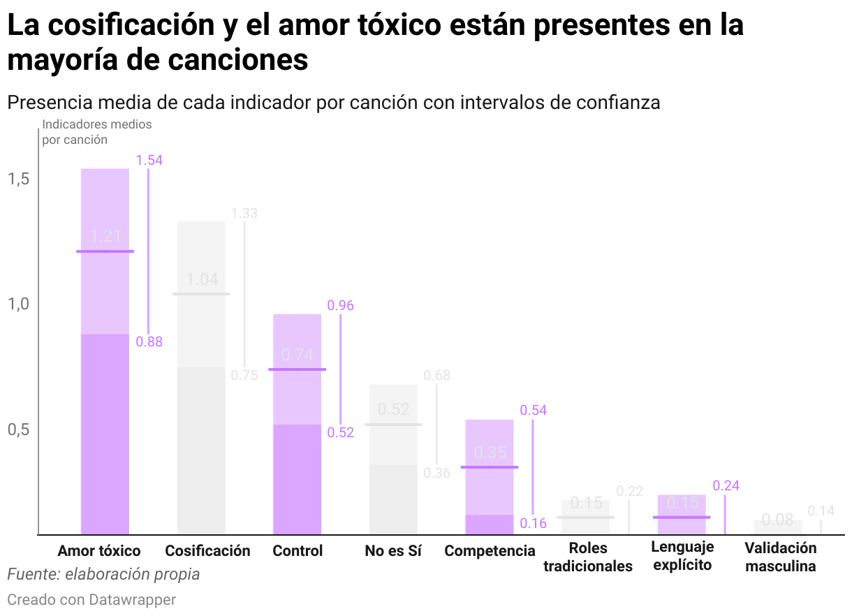 Sin embargo, se debe tener presente que no todas las canciones estudiadas cuentan con indicadores machistas y, cuando lo hacen, no siempre son los mismos ni en la misma frecuencia. Esta variedad entre canciones se aprecia gracias al área sombreada de cada una de las barras. Un ejemplo para comprenderlo fácilmente se sitúa en el indicador de competencia. La presencia media de este es de 0,3, por lo que se podría llegar a presuponer que una de cada tres canciones contiene algún tipo de verso en el que un hombre o una mujer compiten por otra. Sin embargo, el área sombreada es muy amplia, y va desde el 0,15 hasta el 0,55. Esta incertidumbre permite suponer que, si bien en algunas de las canciones estudiadas la competición por una pareja o sexual es muy común, en la gran mayoría ni siquiera aparece.